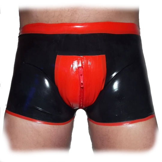 Shorts - Schwarz mit rotem Rand und Reißverschluss am Schritt Latex handgemacht, geklebt Material: 100 % Latex Wahlweise auch in diesen Farben lieferbar (Sonderanfertigung). Voll-farben Schwarz Blau Fleisch Orange Violett Rot Weiß Gelb Transparent...Normaler Preis €54,95 -