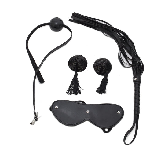 SM-Set Geschenkset: Mundknebel, Augenmaske, Nippelaufkleber und Peitsche Farbe: schwarz Material: 100 % KunstlederNormaler Preis €21,95 -