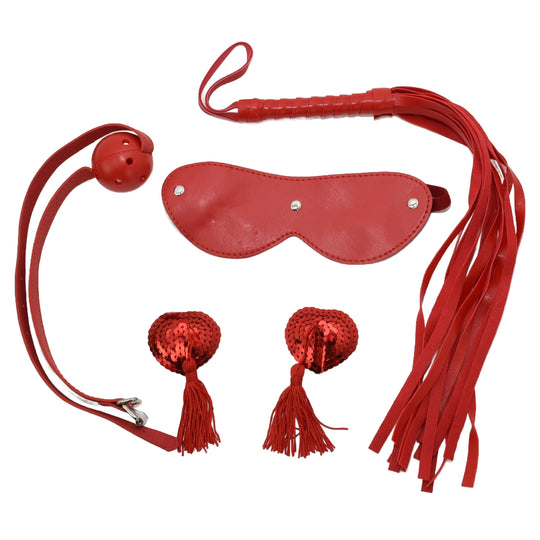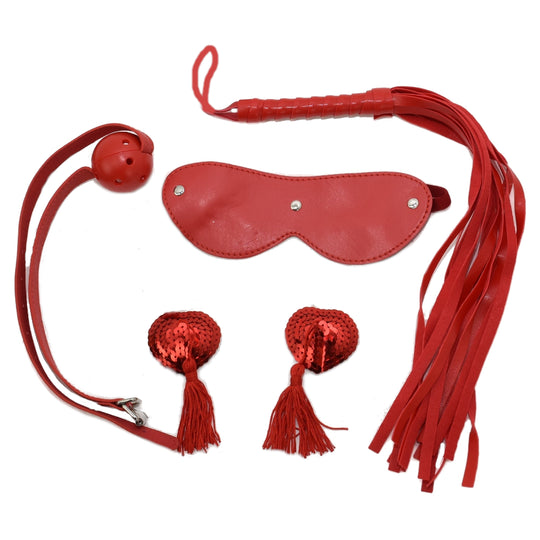 SM-Set Geschenkset: Mundknebel, Augenmaske, Nippelaufkleber und Peitsche Farbe: rot Material: 100 % KunstlederNormaler Preis €21,95 -