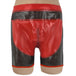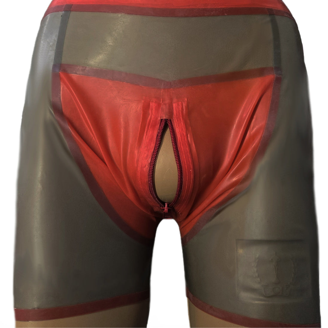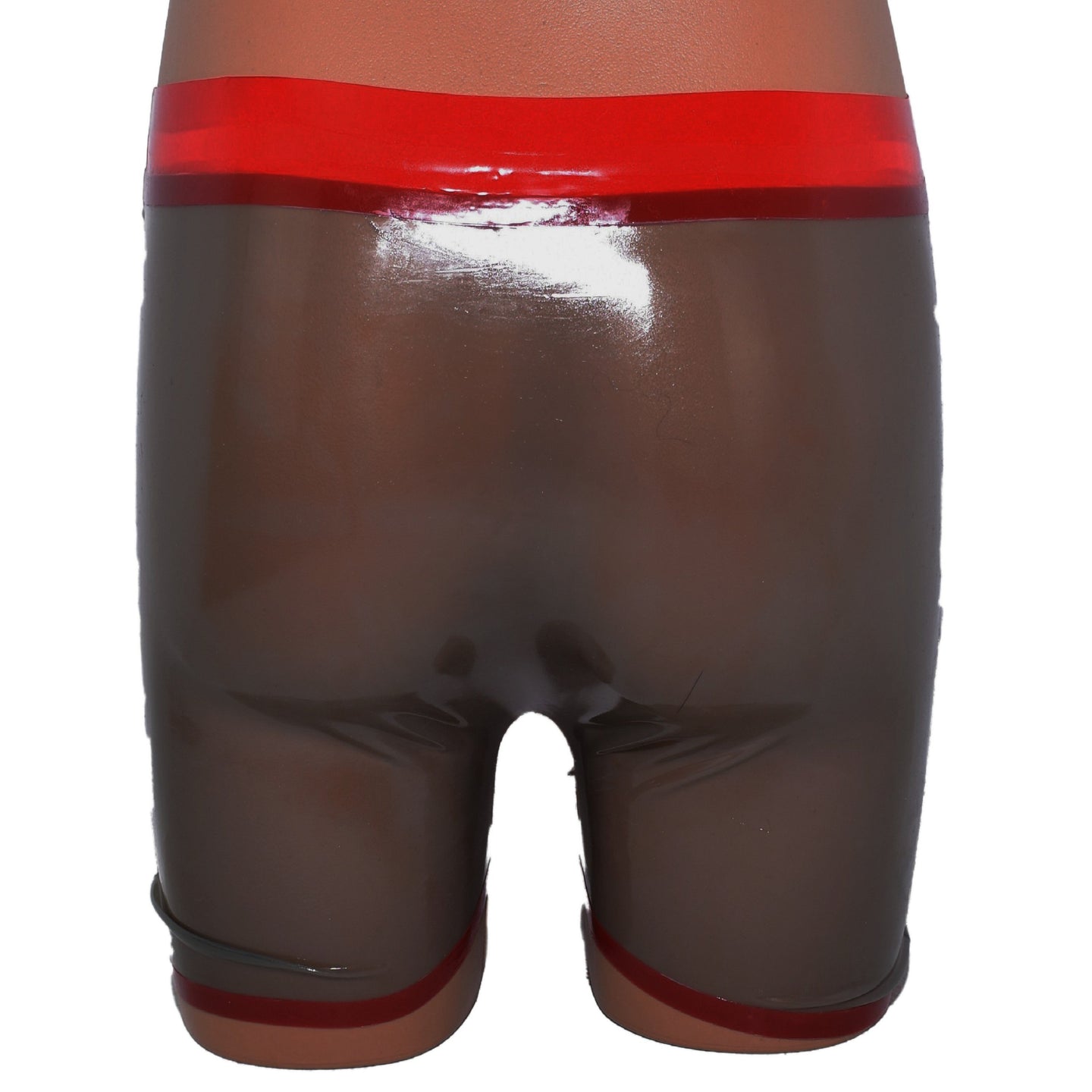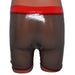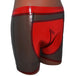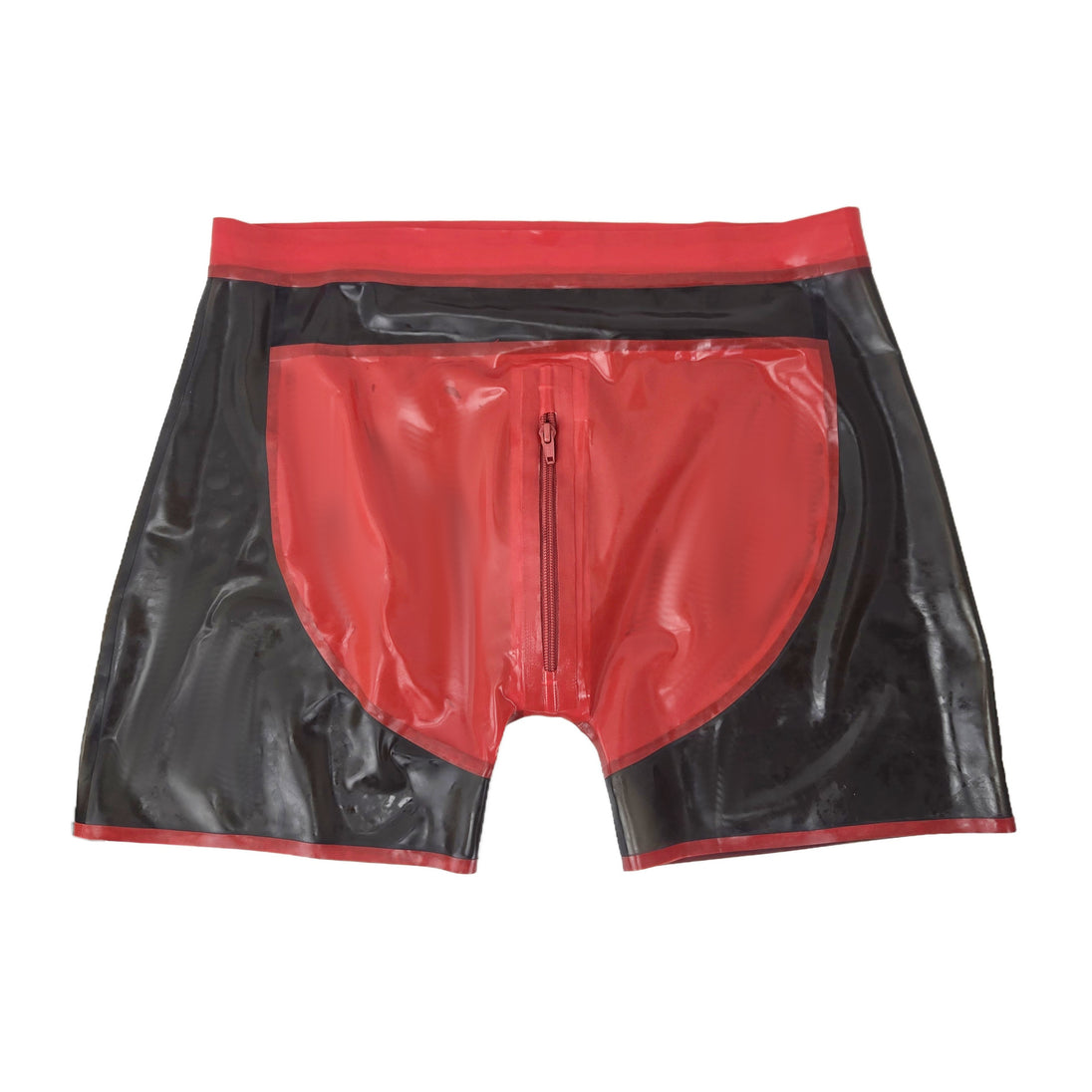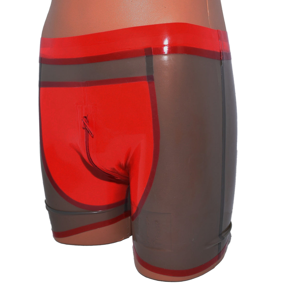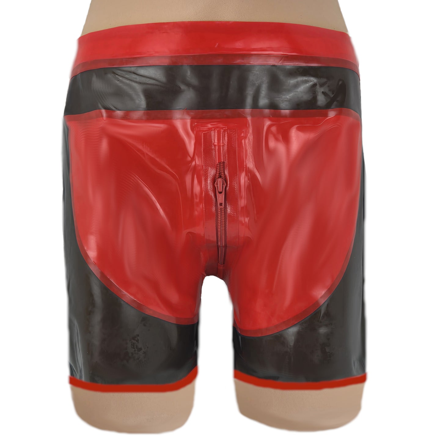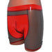 Shorts mit Reißverschluss vorne. Schwarz-Transparent mit rotem Einsatz.