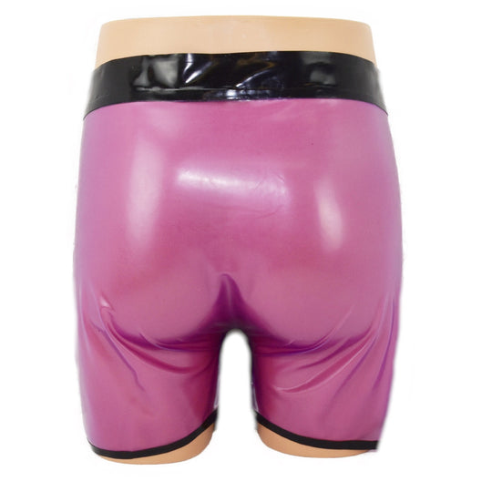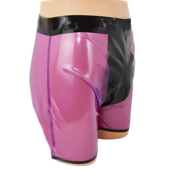 Shorts mit schwarzem Einsatz Lila-transparent Latex handgemacht, geklebt Material: 100 % Latex Wahlweise auch in diesen Farben lieferbar (Sonderanfertigung). Voll-farben Schwarz Blau Fleisch Orange Violett Rot Weiß Gelb Transparent Schwarz Blau Braun Silber Oliv Grün...Normaler Preis €54,00 -