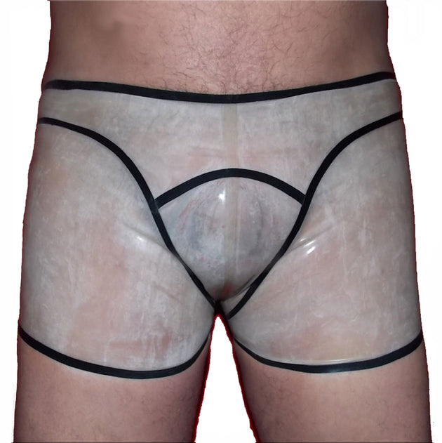 Latex Shorts Reißverschluss Transparent mit rotem Rand
