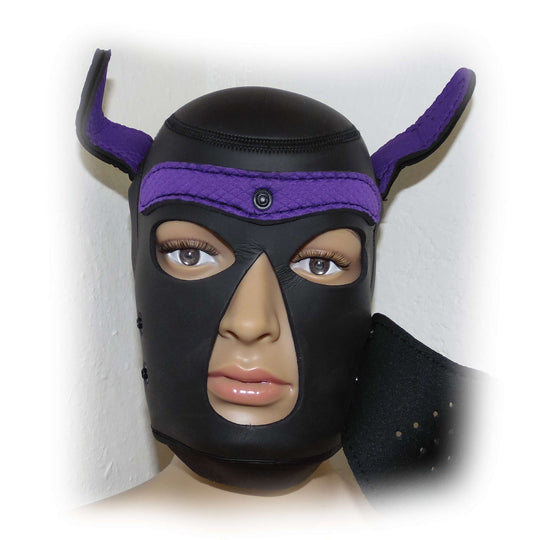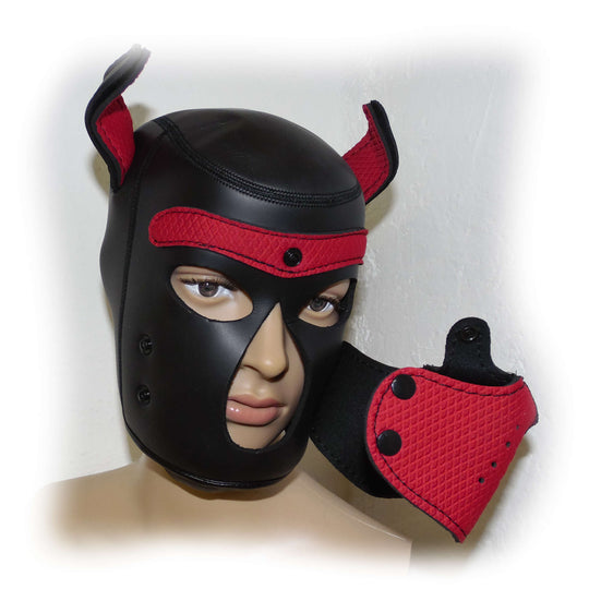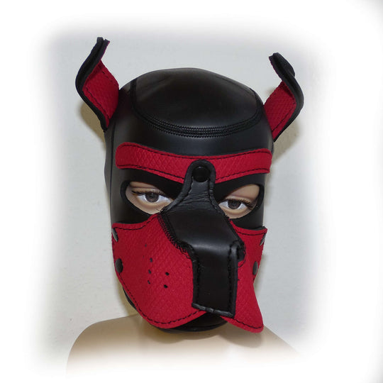 Maske aus schwarz-rotem Lackleder mit Nieten