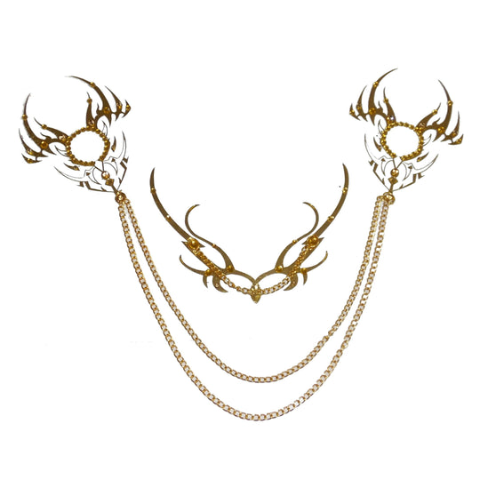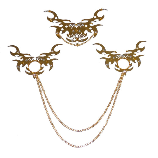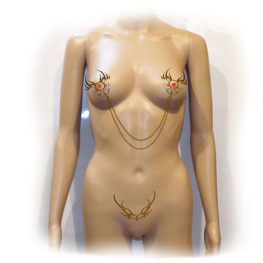 Nippelcover Aufkleber 3-er Set Brust und Schambein mit Strasssteinen und Ketten, Farbe gold Material: KunststoffNormaler Preis €9,45