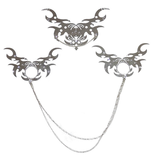 Nippelcover Aufkleber 3-er Set Brust und Schambein mit Strasssteinen und Ketten, Farbe silber Material: KunststoffNormaler Preis €9,45 -