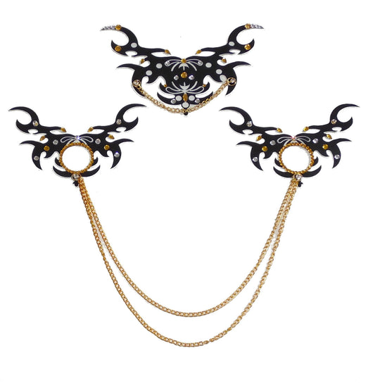 Nippelcover Aufkleber 3-er Set Brust und Schambein mit Strasssteinen und Ketten, Farbe schwarz Material: KunststoffNormaler Preis €9,45 -