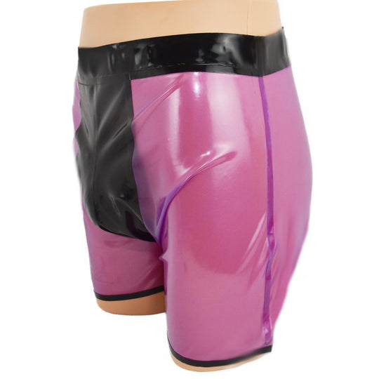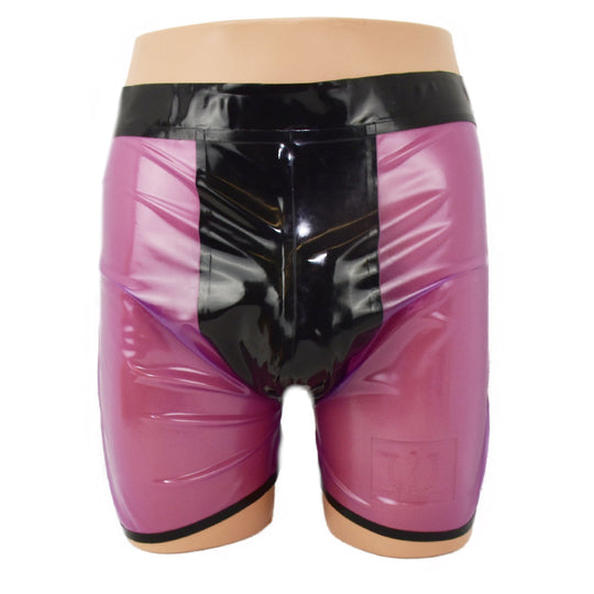 Shorts mit schwarzem Einsatz Lila-transparent Latex handgemacht, geklebt Material: 100 % Latex Wahlweise auch in diesen Farben lieferbar (Sonderanfertigung). Voll-farben Schwarz Blau Fleisch Orange Violett Rot Weiß Gelb Transparent Schwarz Blau Braun Silber Oliv Grün...Normaler Preis €54,00 -