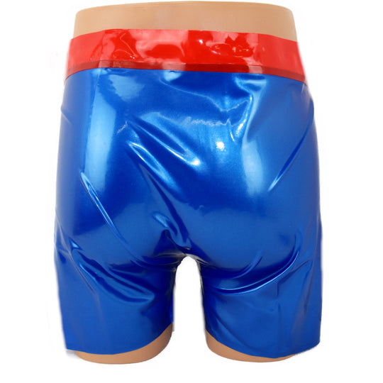 Latex Shorts - mit rotem Bund und Reißverschluss Blau-metallic Latex handgemacht, geklebt Material: 100 % Latex Wahlweise auch in diesen Farben lieferbar (Sonderanfertigung). Voll-farben Schwarz Blau Fleisch Orange Violett Rot Weiß Gelb Transparent Schwarz Blau...Normaler Preis €65,95 -